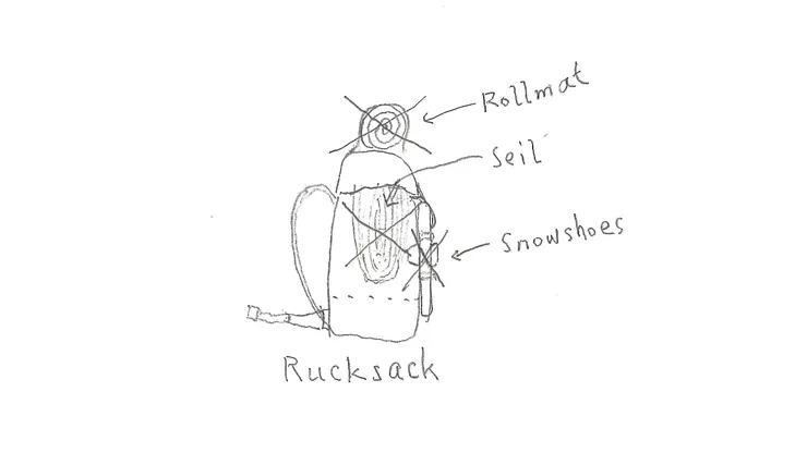 ②リュックサックの外に縛り付けたマットや道具類はすべて外します(必須)。