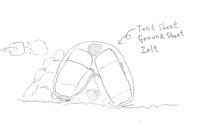 ③リュックサックを重ね隙間にマット類を突っ込んでシートで覆います。このとき、リュックサックの負紐を内側にし、ウエストベルトも内側にきっちり折りたたみましょう。シートの余った端はリュックサックの下に押し込んでください(重要!)。後は雪を上に乗っけて時々スコップでたたいて固めて十分な厚さ(15cmくらい?)にしてください。